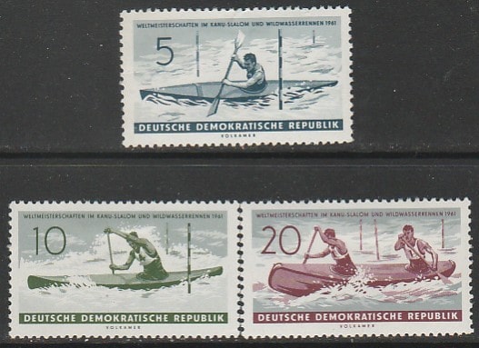 ГДР 1961 год. Слалом на каноэ, 3 марки (наклейка)