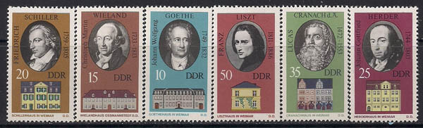 ГДР 1973 год. Дома-музеи исторических личностей в Веймаре. 6 марок с НАКЛЕЙКОЙ