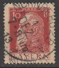 Германия (Бавария) 1911 год. Принц - регент Баварии Луитпольд Баварский, ном. 10 Pf, 1 марка из серии (гашёная) (1 из 16, разные гашения)