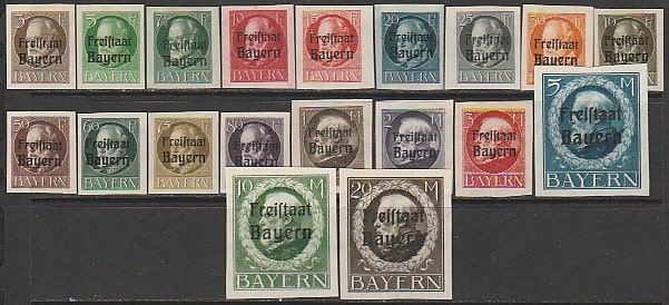 Германия (Бавария) 1920 год. Стандарт. Король Баварии Людвиг III, надпечатка, 19 б/зубц. марок (наклейка)