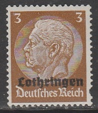 Германия (III Рейх. Аннексия Лотарингии) 1940 год. Стандарт. Рейхспрезидент Пауль фон Гинденбург, (ном. 3 Pf), НДП, 1 марка из серии. (1 из 16) (1,5/1,2)