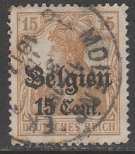 Германия (Оккупация Бельгии, I Мировая) 1916/1918 год. Стандарт. Аллегория. Германия с императорской короной, ном. 15 С/15 Pf, надпечатка, 1 марка из серии (гашёная) (1 из 16)