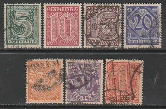 Германия. (Веймарская республика) 1920 год. Непочтовые служебные марки для Пруссии, 7 марок (гашёные)