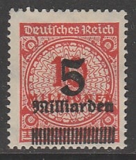Германия (Веймарская республика) 1923 год. Стандарт. Цифровой рисунок в круге с розетками, надпечатка нового номинала, 5Mrd/10Mio M, 1 марка из серии (наклейка) (1 из 6)