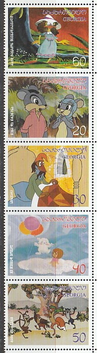 Грузия 1997 год. Персонажи национальных мультфильмов, 5 марок в сцепке.