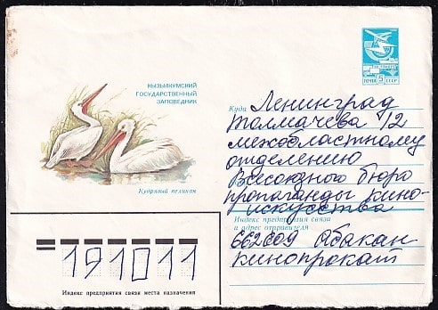 ХМК 82-607 Кызылкумский гос. заповедник. Кудрявый пеликан. Выпуск 6.12.1982, прошел почту