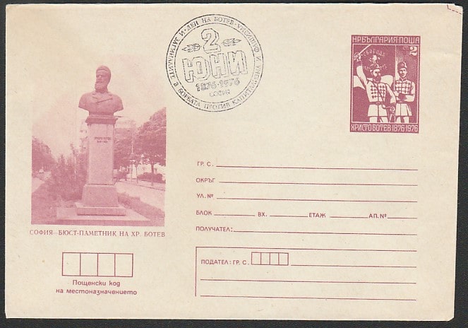 ХМК Болгарии. Бюст - памятник Христо Ботеву в Софии, спецгашение, 1976 год.