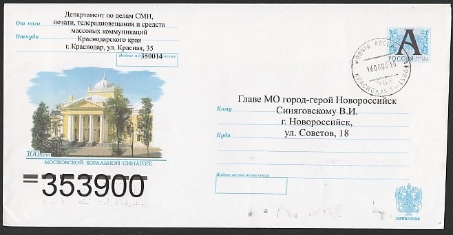 ХМК с литерой "А". 100 лет Московской хоральной синагоге, 2006 год, прошёл почту