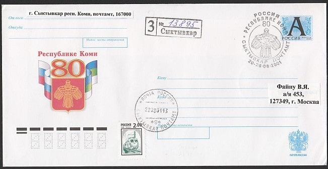 ХМК с литерой "А" и спецгашением. 80 лет Республике Коми, 20-26.08.2001 год, Сыктывкар, заказное, прошёл почту