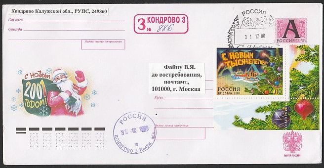 ХМК с литерой "А" и спецгашением. С Новым годом!, 31.12.2000 год, Кондрово, Калужской обл., заказное, прошёл почту