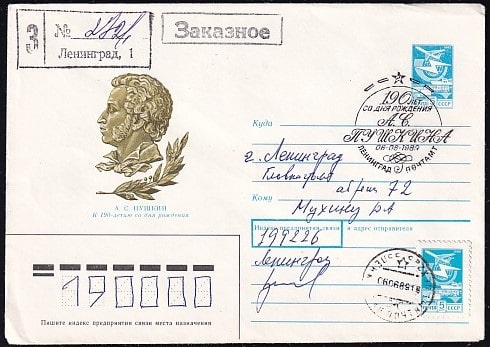 ХМК со СГ "190 лет со дня рождения А. С. Пушкина", 6.06.1989 год, Ленинград, прошел почту