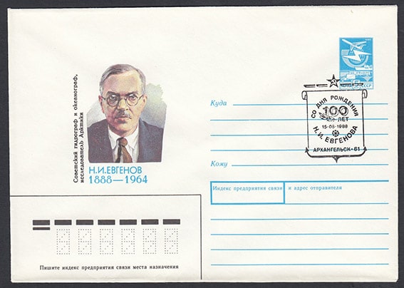 ХМК со спецгашением - 100 лет со дня рождения Н.И. Евгенова, Архангельск 18.08.1988 год