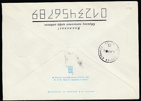 ХМК со спецгашением. День космонавтики, 12.04.1985 год, Космодром Байконур, прошёл почту (+1Ю) КШ: Космодром Байконур, 12.04.1985 год.