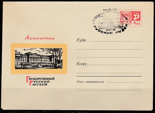 ХМК со спецгашением. Ленинград. Русский музей, СГ первого дня, 25.12.1968 год, Ленинград, почтамт.