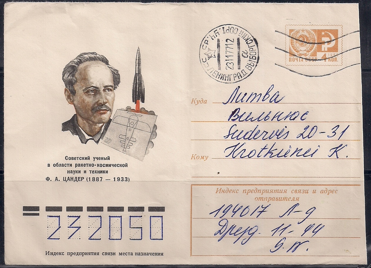 ХМК. Советский ученый в области ракетно-космической техники Ф.А. Цандер, 05.07.1977 год, № 77-364, прошел почту