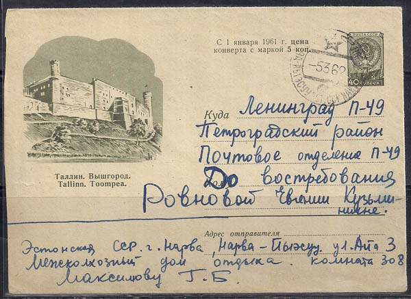 ХМК. Таллин. Вышгород. № 60-236, 11.10.1960 год, переоценка, прошёл почту