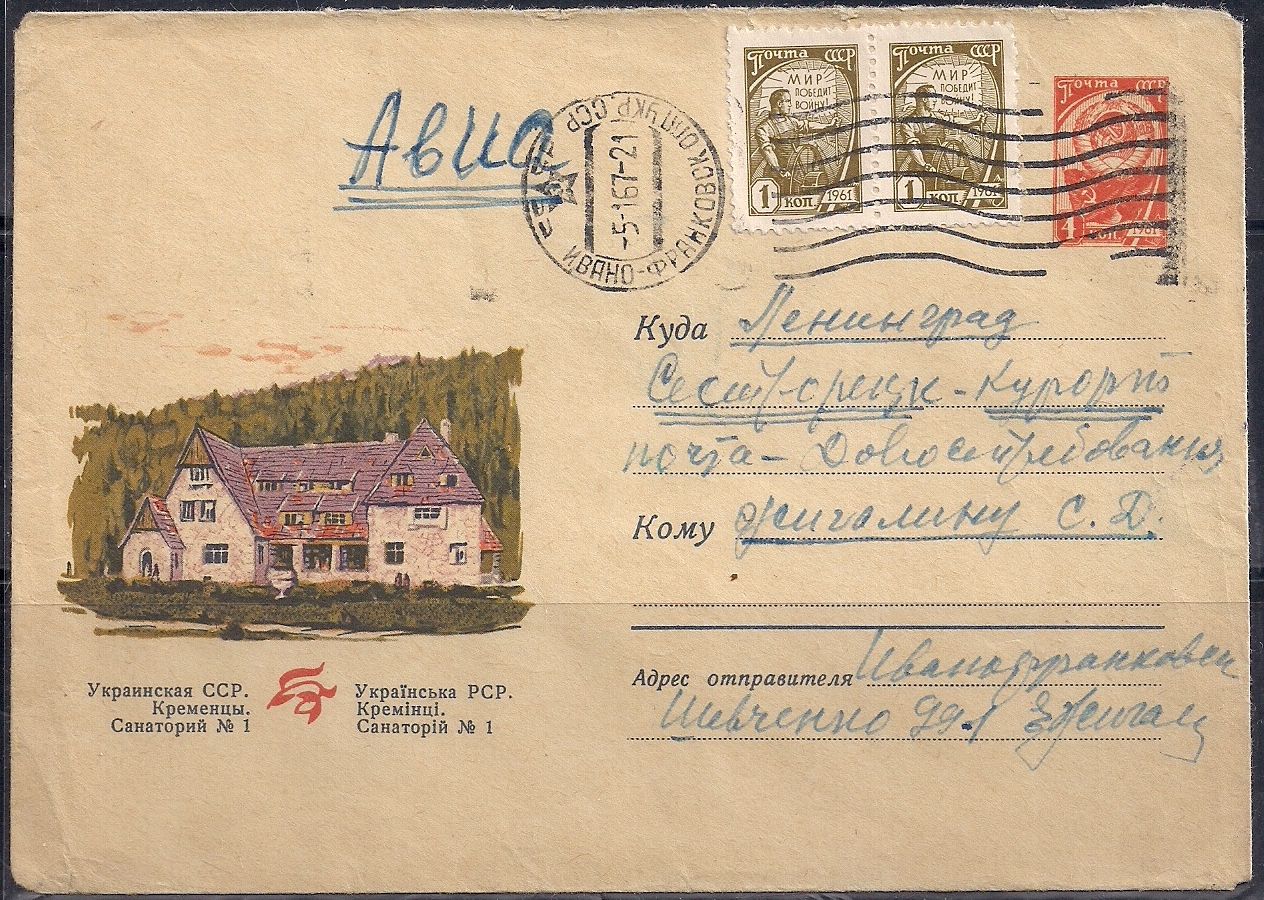 ХМК. Украинская ССР. Кременцы. Санаторий № 1, 22.07.1964 год, № 64-346, прошел почту, с пометкой "авиа"