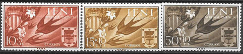 Ифни 1958 год. Помощь Валенсии. Дымчатые ласточки и герб Валенсии. 3 марки