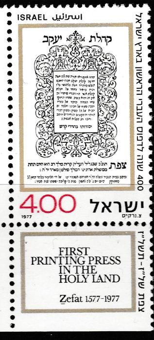 Израиль 1977 год. 400 лет еврейской типографии в Цфате. 1 марка с купоном