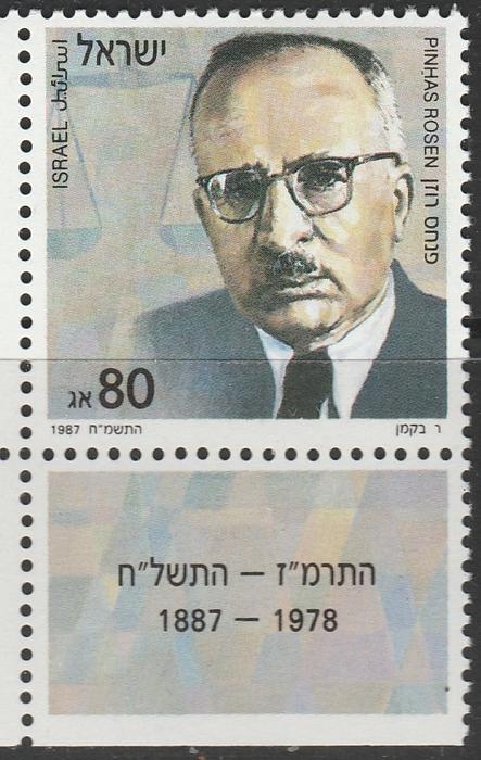 Израиль 1987 год. 100 лет со дня рождения Пинхаса Розена, политика, первого министра юстиции Израиля. 1 марка с купоном