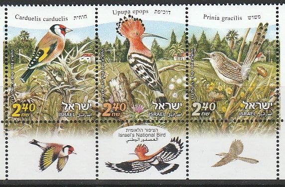 Израиль 2010 год. Птицы, 3 марки с купонами в сцепке (н