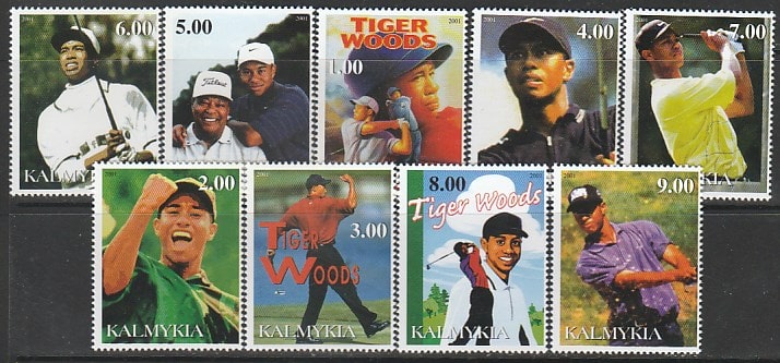 Калмыкия 2001 год. Американский гольфист Тайгер Вудс, 9 марок. Сувенирный выпуск.