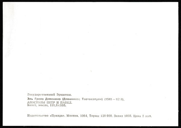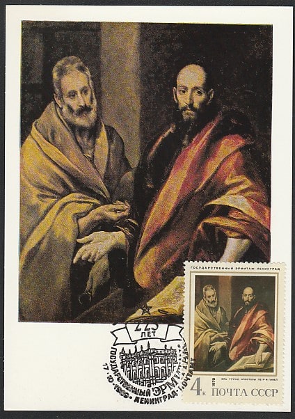Картмаксимум. 225 лет Государственному Эрмитажу. Картина Эль Греко "Апостолы Пётр и Павел", 17.10.1989 год, Ленинград, почтамт