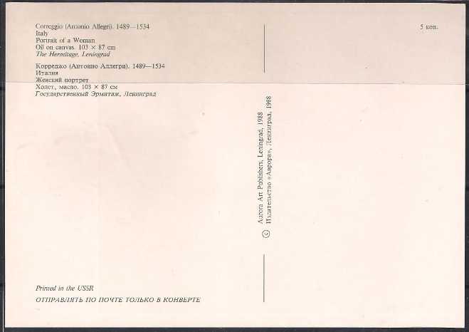 Картмаксимум. 225 лет Государственному Эрмитажу. Картина Корреджо "Женский портрет", 17.10.1989 год, Ленинград почтамт