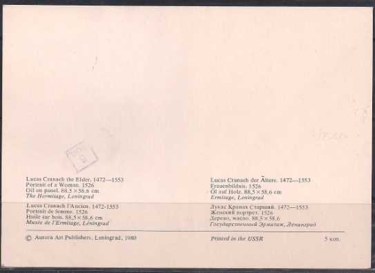 Картмаксимум. 225 лет Государственному Эрмитажу. Картина Кронаха старшего "Женский портрет", 17.10.1989 год, Ленинград почтамт