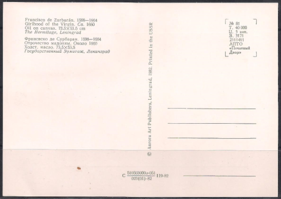Картмаксимум. 225 лет Государственному Эрмитажу. Картина Сурбарана "Отрочество мадонны", 17.10.1989 год, Ленинград почтамт
