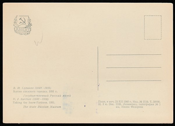Картмаксимум. Картина В.И. Сурикова "Взятие снежного городка". Государственный Русский музей, 10.12.1990 год, Ленинград