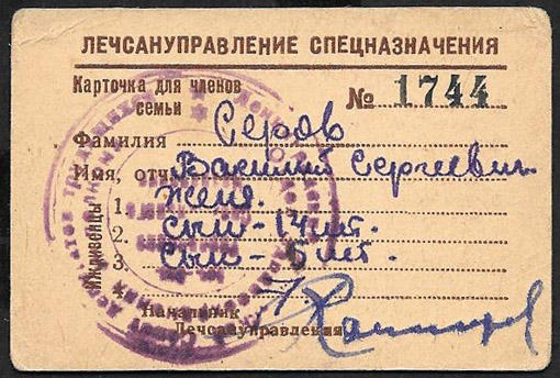 Карточка для членов семьи. Лечсануправление спецназначения № 1744, 1948 год