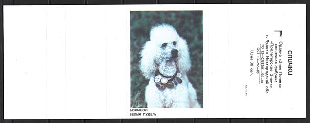 Фауна › Картонная коробка кабинетного формата для четырёх коробков со спичками. Пролетарское Знамя. Большой белый пудель