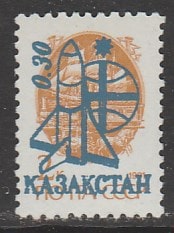 Казахстан 1992 год. Совместный космический полёт России и Франции. НДП нового номинала 0,30R/2К на стандарте СССР, 1 марка.