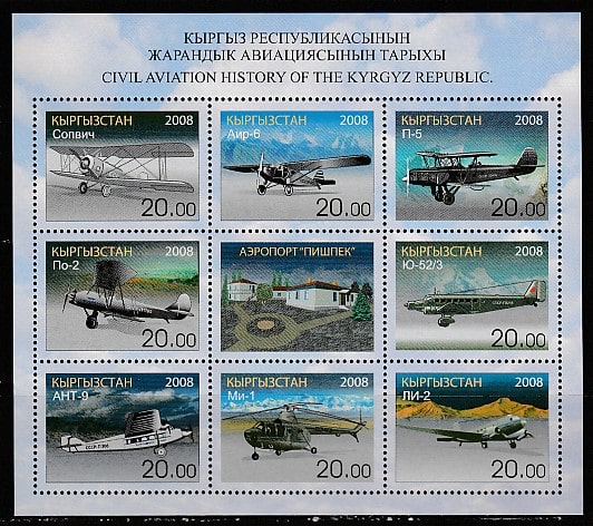 Киргизия 2008 год. История гражданской авиации (III), малый лист (н