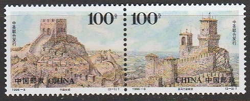 Китай (КНР) 1996 год. 25 лет дипотношениям между КНР и Сан-Марино, пара марок.