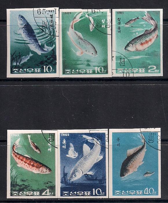 КНДР 1965 год. Речные рыбы. 6 гашеных марок без зубцов