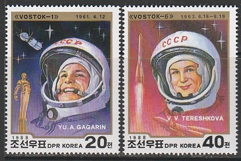 КНДР 1988 год. Космонавты: Валентина Терешкова и Юрий Гагарин, 2 марки.