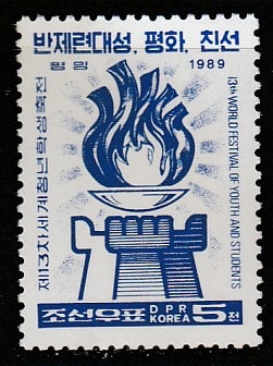 КНДР 1989 год. XIII Международный фестиваль молодёжи и студентов в Пхеньяне, Символика, 1 марка из двух.