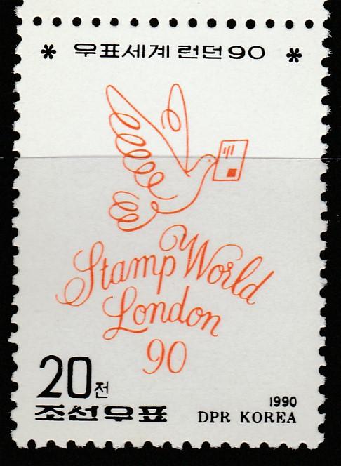 КНДР 1990 год. Международная филвыставка "Stamp World London-90". Птица с письмом. 1 марка