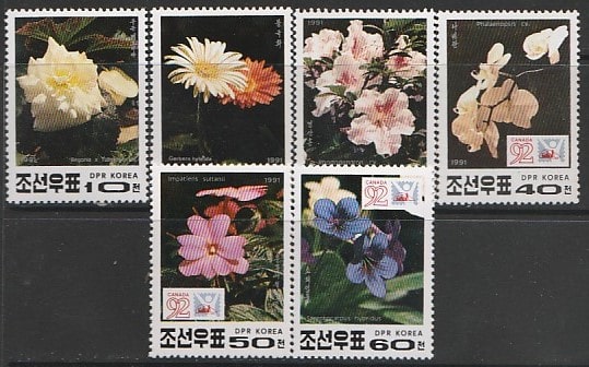 КНДР 1991 год. Международная молодёжная филвыставка в Монреале. Цветы, 6 марок.