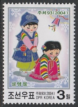 КНДР 2004 год. Китайский Новый год. Дети в снегу, 1 марка.