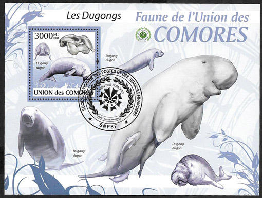 Коморы, 2009 год. Дюгонь-водное млекопитающее. 1 гашёный блок + 1 гашёный лист