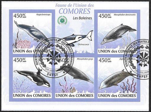 Коморы, 2009 год. Киты. 1 гашёный блок + 1 гашёный беззубцов. лист