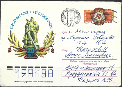 Конверт 20 лет Советскому комитету ветеранов войны. 02.08.1976 год. Прошёл почту