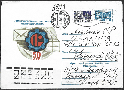 Конверт Авиа. 50 лет союзному заводу "Промсвязь". 06.06.1975 год. Прошёл почту