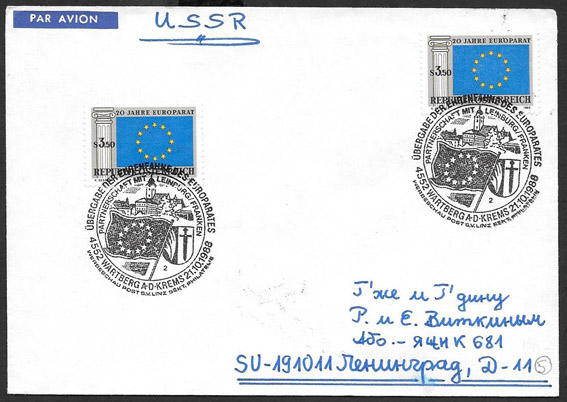 Конверт Авиа со спецгашением - 20 лет ЕЭС. Австрия. Гаш. 21.10.88 г.