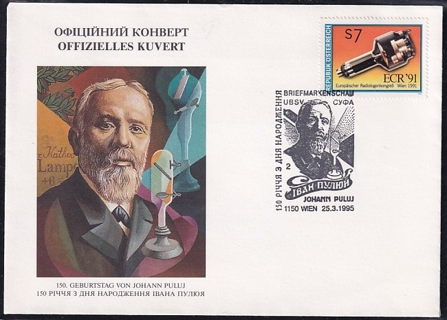 Конверт Австрии со спецгашением "150 лет со дня рождения Ивана Пулюя", 25.03.1995 год, Вена