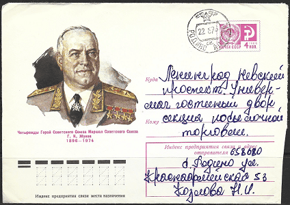 Конверт Четырежды Герой Советского Союза Маршал Советского Г.К.Жуков. 05.11.1975 год. Прошёл почту.