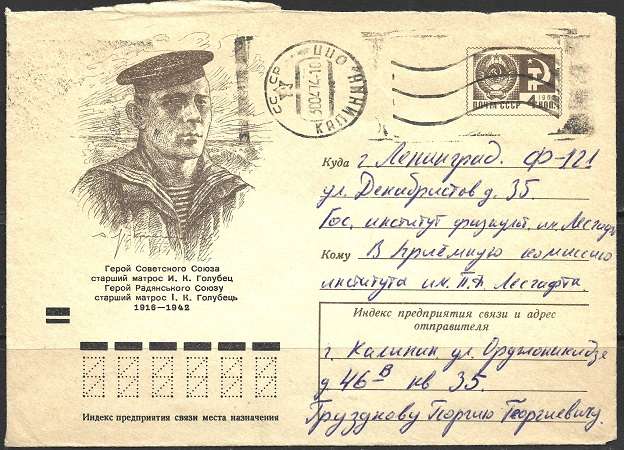 Конверт Герой Советского Союза старший матрос И.К. Голубец. Прошел почту. 04.01.1974 год.